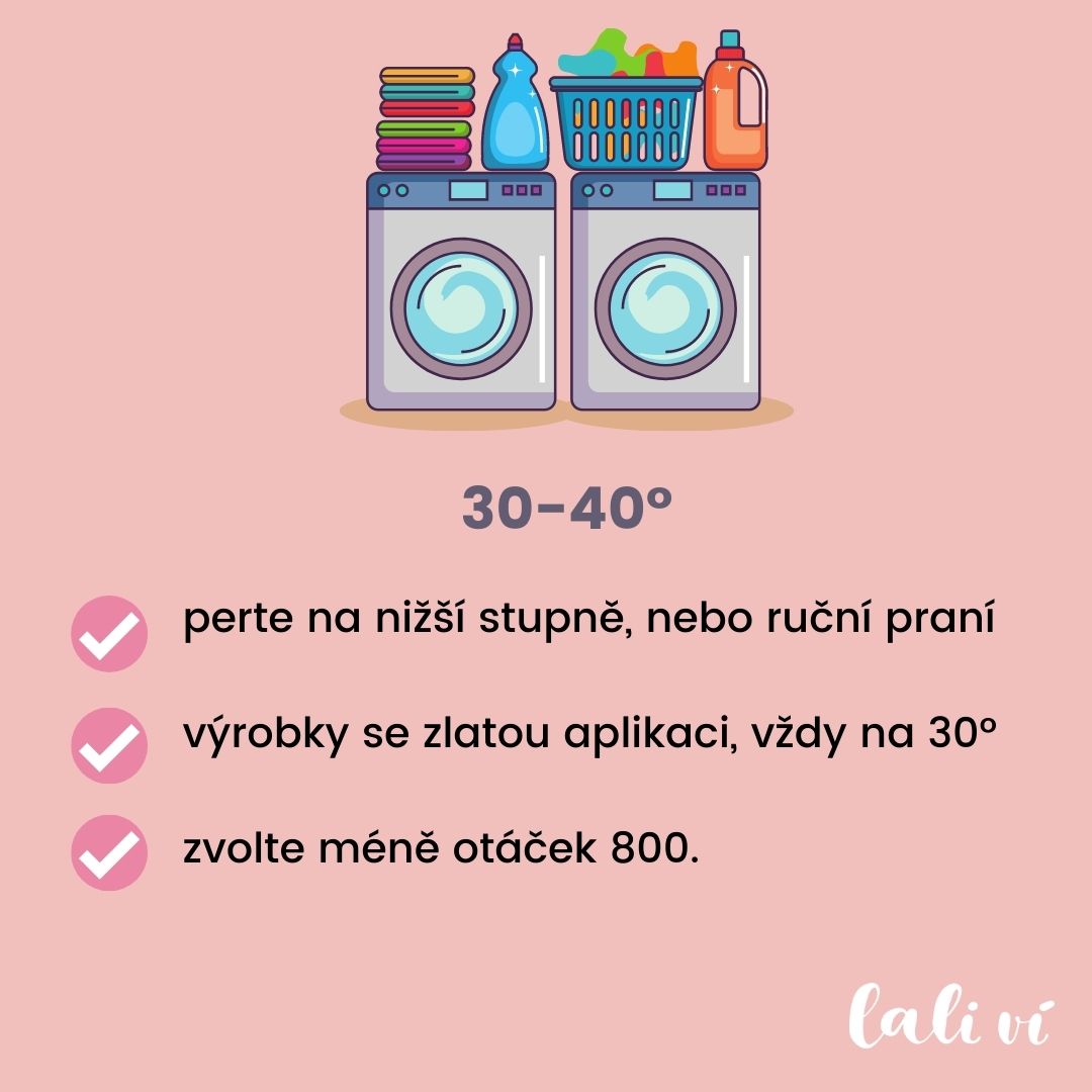 Perte vždy na 30-40°, pokud si nejste jistí vždy na 30°, tím totiž nikdy nic nezkazíte! ????  Látky se zlatou aplikací doporučuji obecně raději na 30°, ozdoby jsou náchylnější k opotřebení a tak je třeba extra jemná péče.